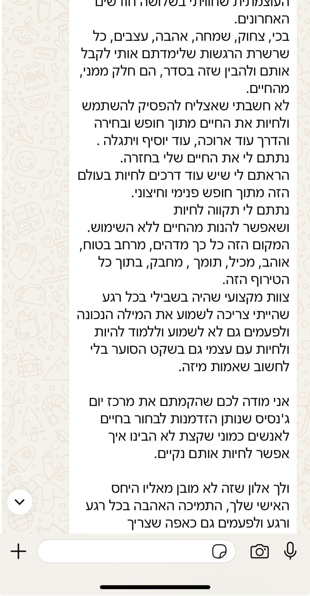 מתוך ניסיון החיים העצום והכלים שרכשתי במסע שלי, מאמינה בכל הלב בפוטנציאל וביכולות של כל אדם ובהתפתחות אישית מתמשכת לצעדים פשוטים וקטנים בדרך של ריפוי והחלמה בחיי האנשים.
