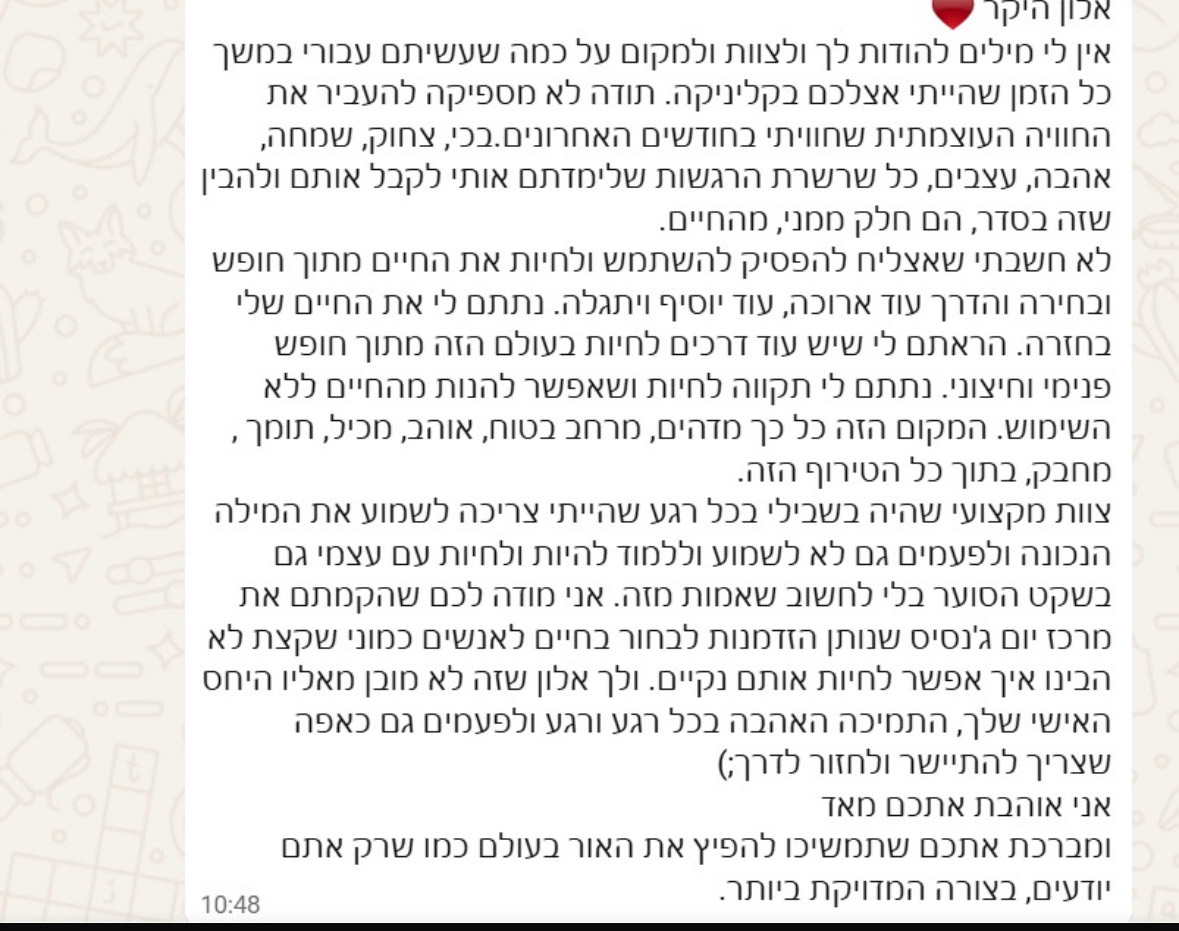 כל מטופל מקבל ליווי מותאם אישית מתוך הקשבה, רגישות ודיסקרטיות מלאה.