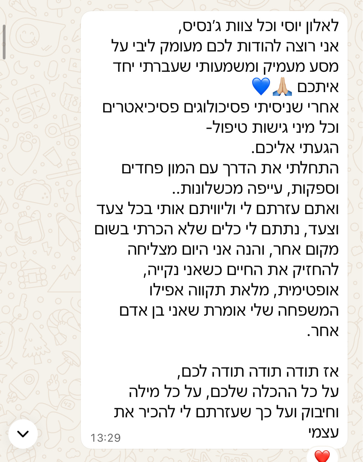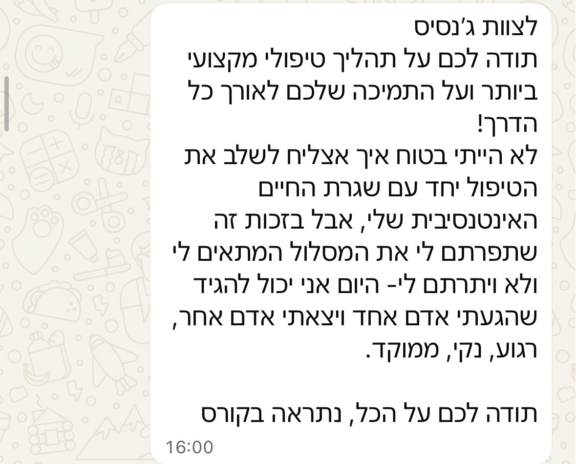 ● תמיכה משפחתית והדרכות לבני משפחה כדי שאף אחד לא ישאר לבד במסע.